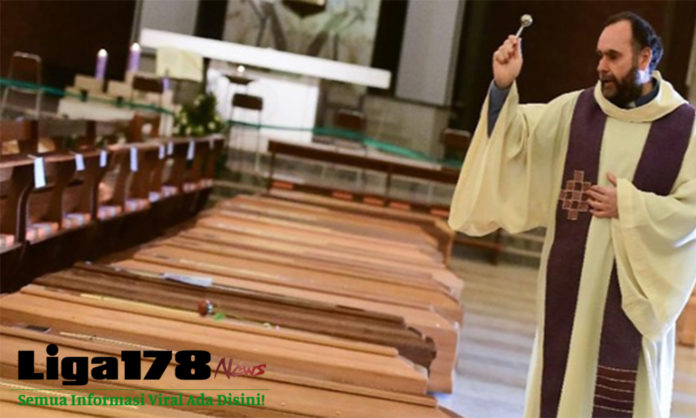 Tampak pendeta Don Marcello memberikan pemberkatan di gereja San Giuseppe terhadap pilihan peti jenazah warga yang meninggal akibat Covid-19 in Seriate, Italia, Sabtu (28/3)Pada Jumat (27/3) kemarin, tercatat 969 orang positif corona meninggal dunia dalam satu hari